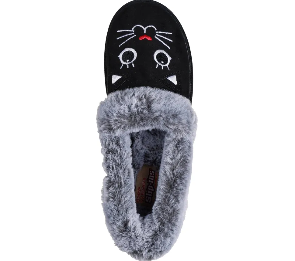 This casual slip-on features a vegan suede upper adorned with a 3D embroidered black cat face, faux fur trim and a Skechers Memory Foam™ insole for cozy comfort with every step.