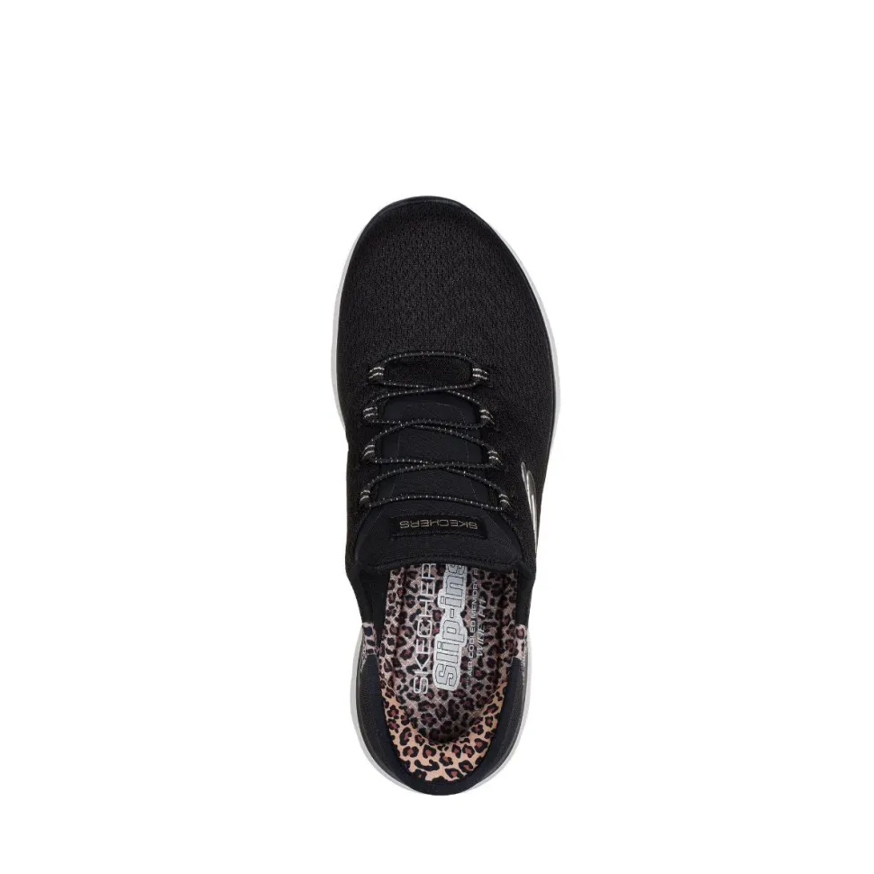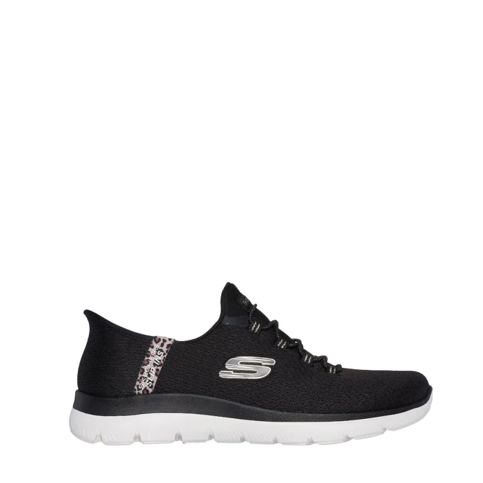 Add a touch of glamour to your step with the Skechers Slip-ins® : Summits – Leopard Chic, combining absolute comfort and effortless style. Designed with our Heel Pillow®, this vegan model features a mesh upper with leopard trim, fixed stretch laces and a comfortable Skechers Air-Cooled Memory Foam® footbed.