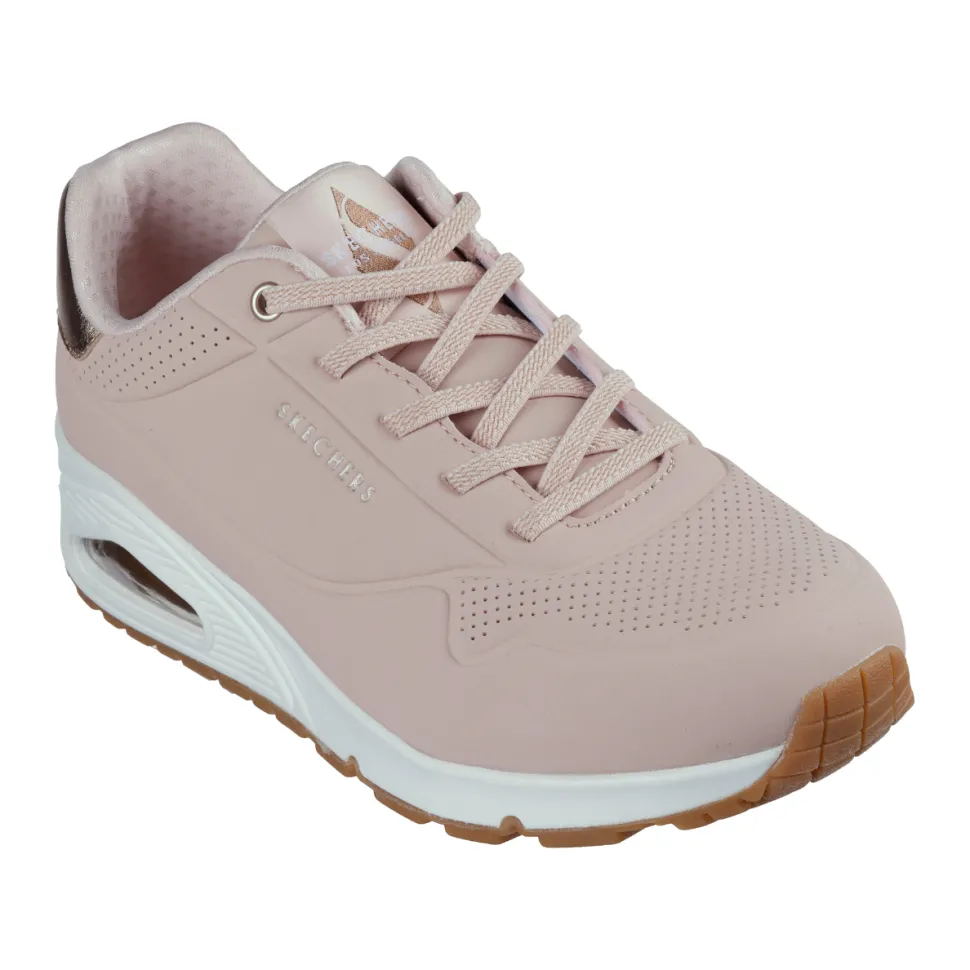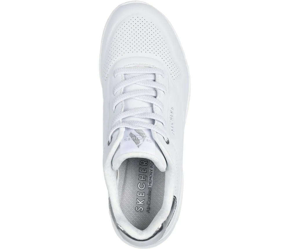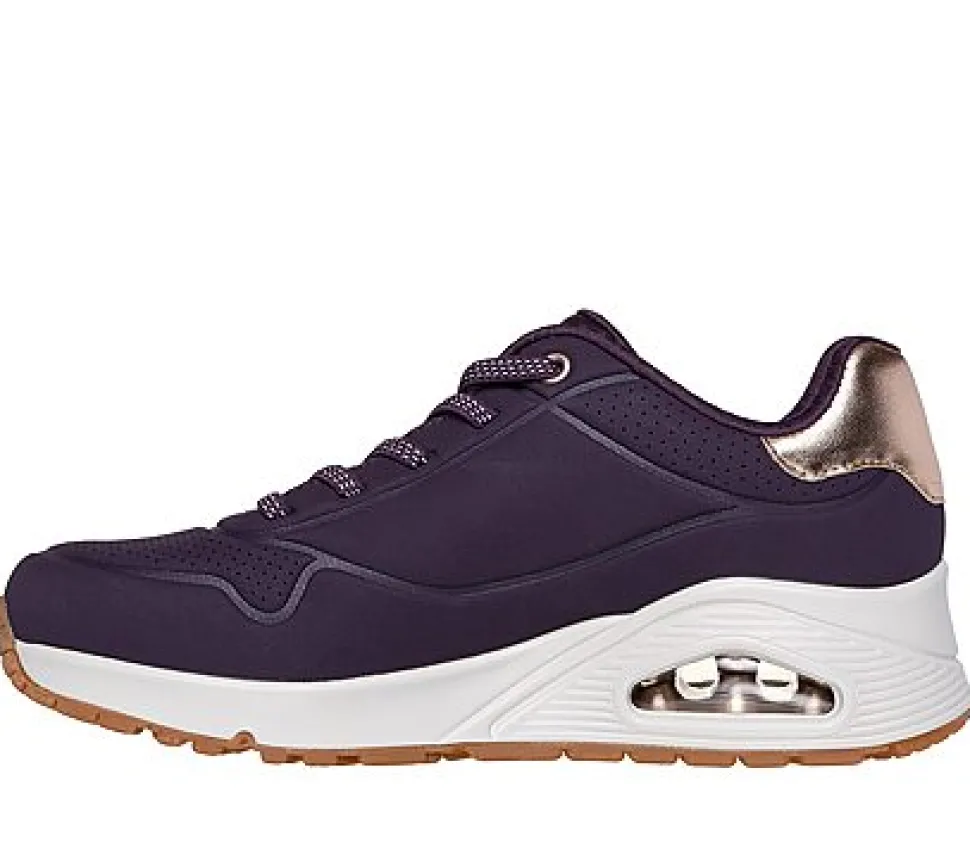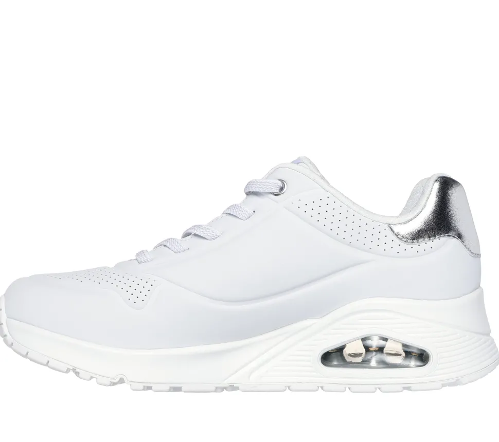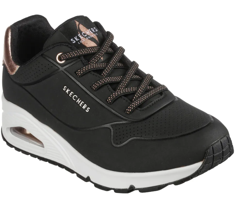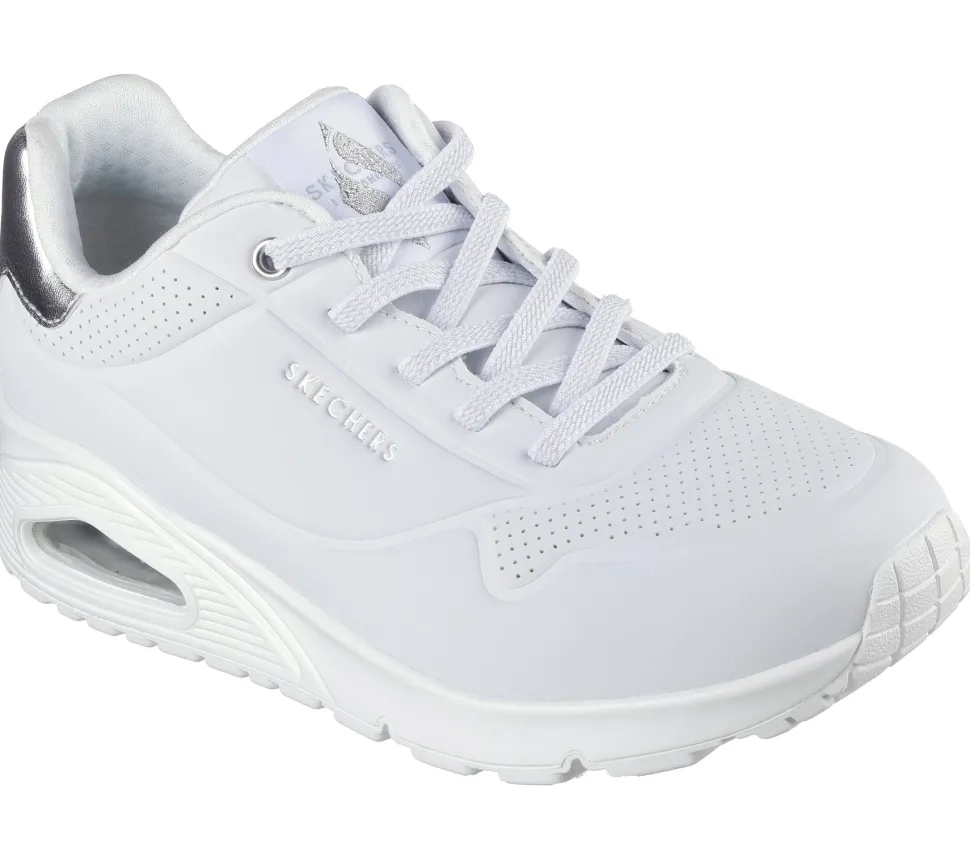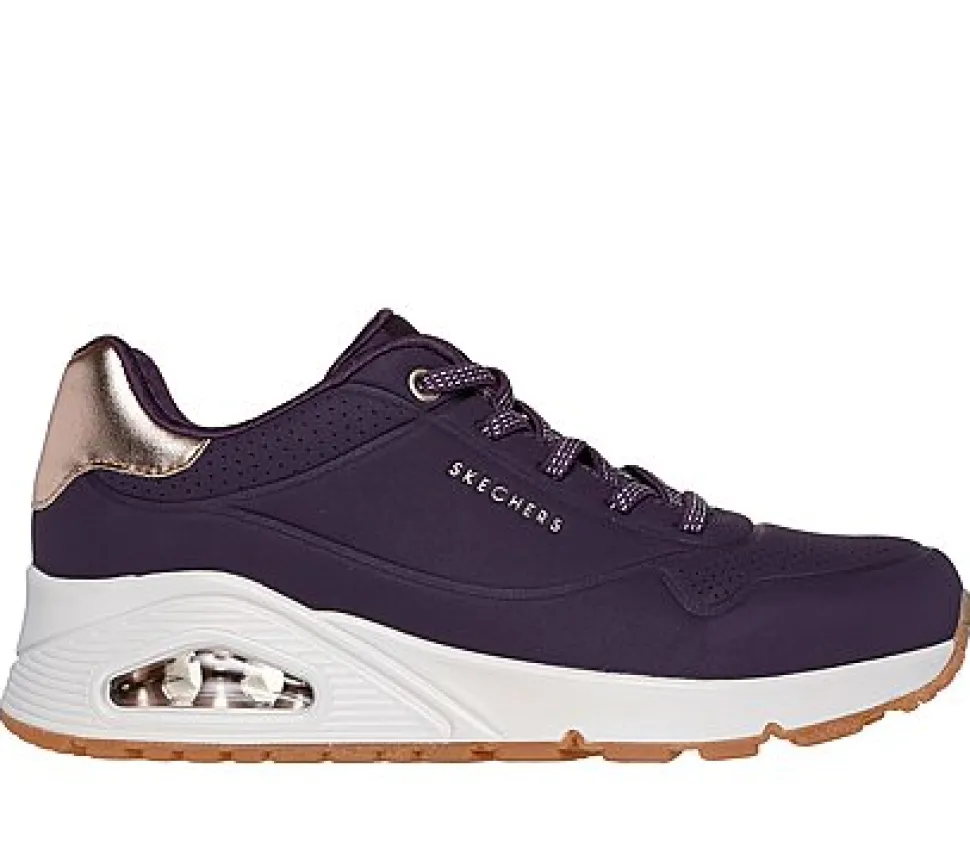 Enjoy classic style this season wearing Skechers Street™ Uno – Shimmer Away. This on-trend sneaker features a synthetic durabuck upper with metallic trim, stretch laces, a Skechers Air-Cooled Memory Foam® insole and a visible Skech-Air® airbag. midsole.