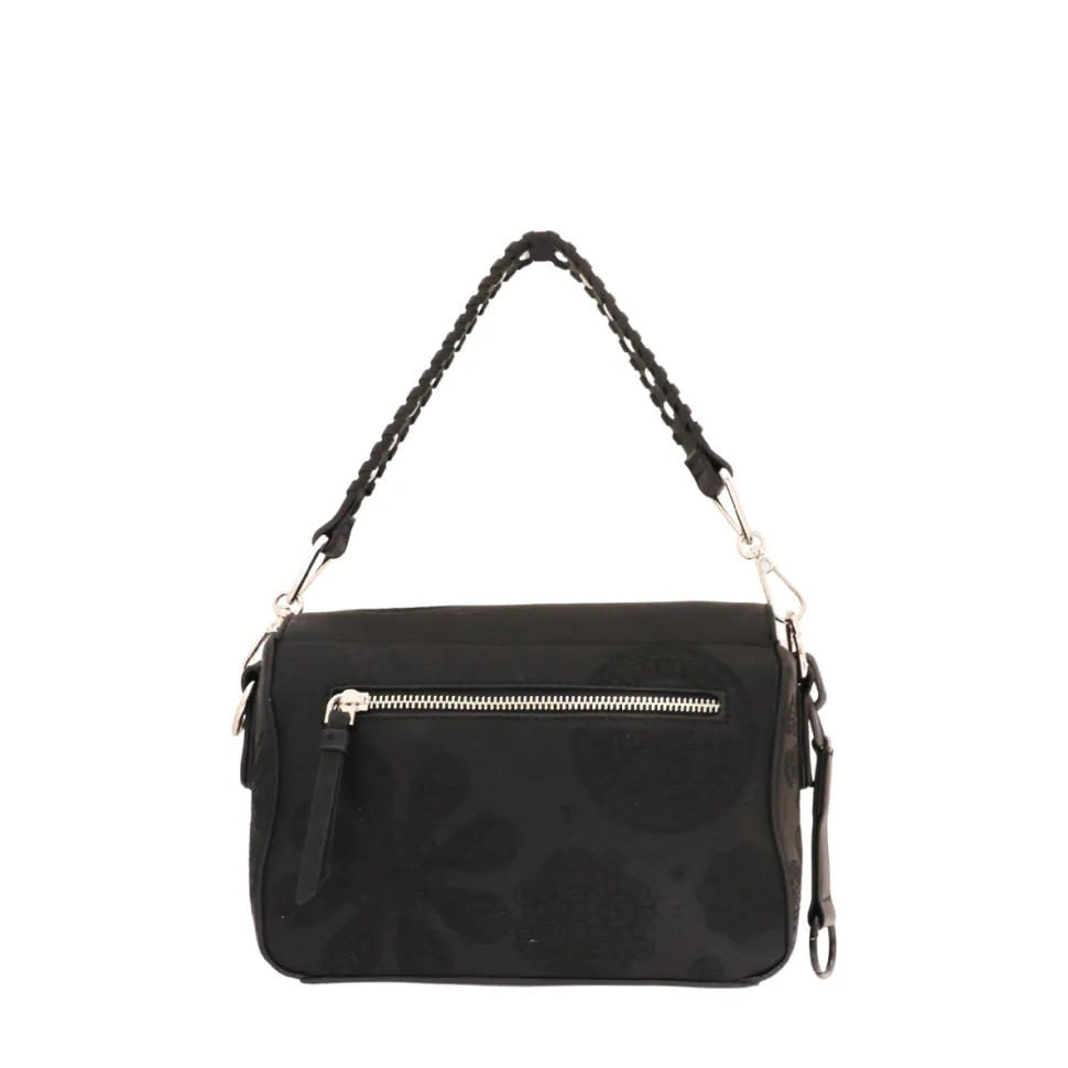 This black handbag from Desigual combines sobriety and originality thanks to its tone-on-tone floral or mandala motif, subtly embossed on the flap and body of the bag. Its classic rectangular shape is enhanced by modern details, making it a versatile accessory for all occasions.