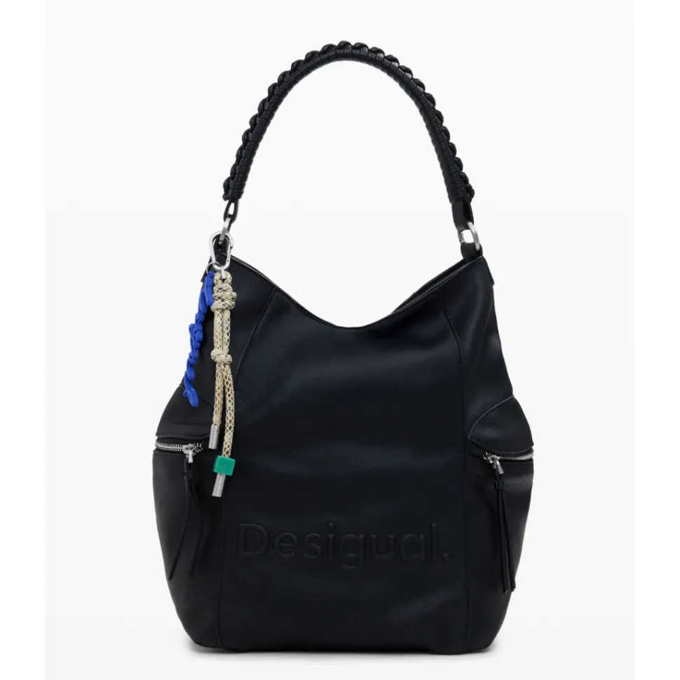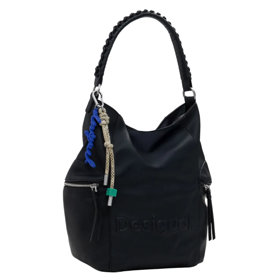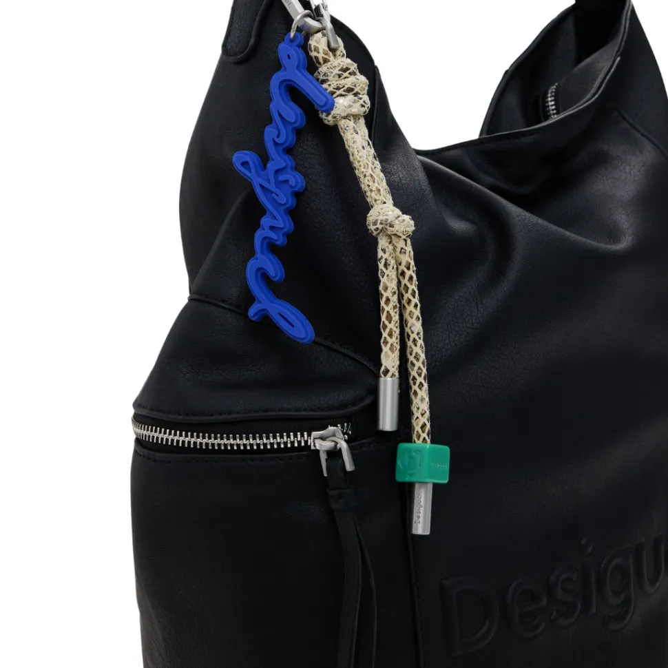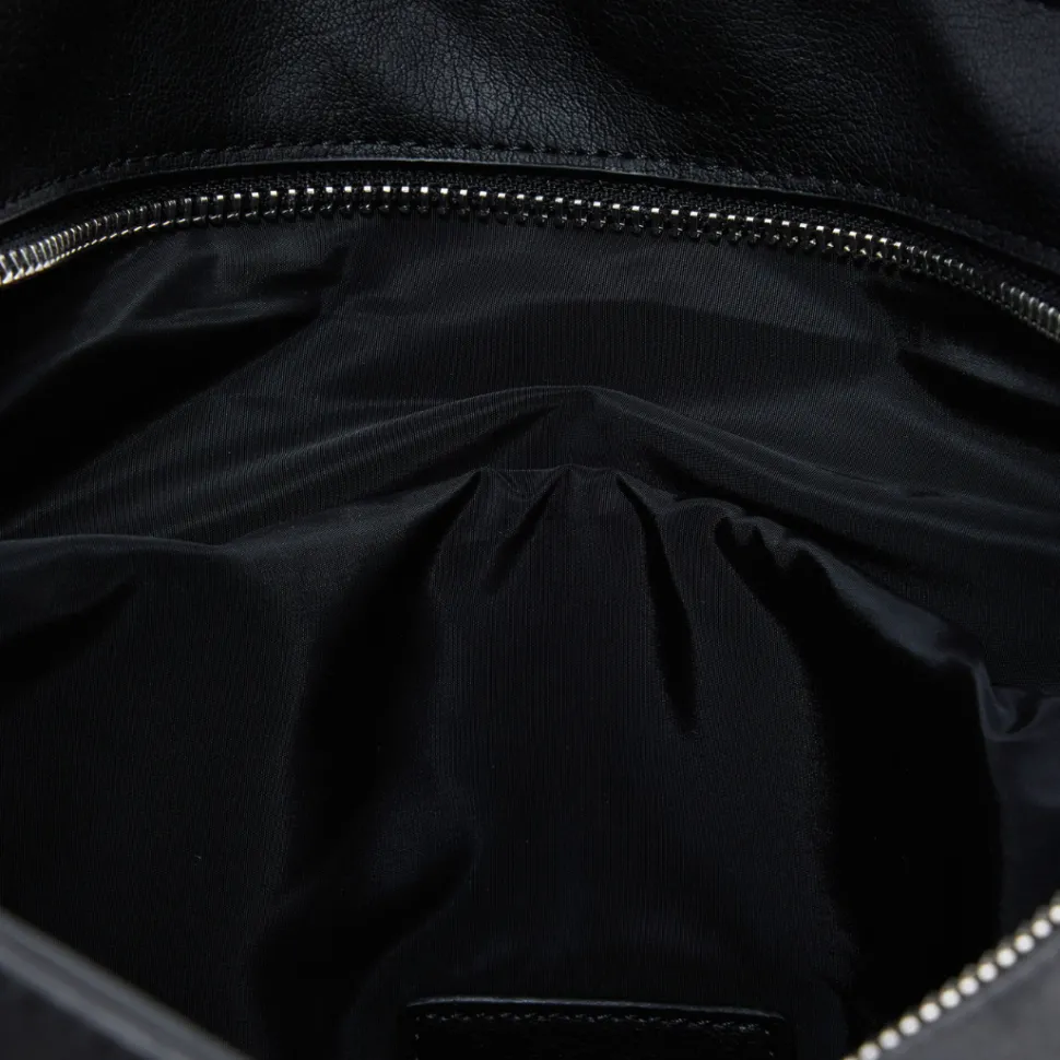 Large faux-leather backpack with 3D embossed logo, zipper closure and removable straps for conversion into a bag.