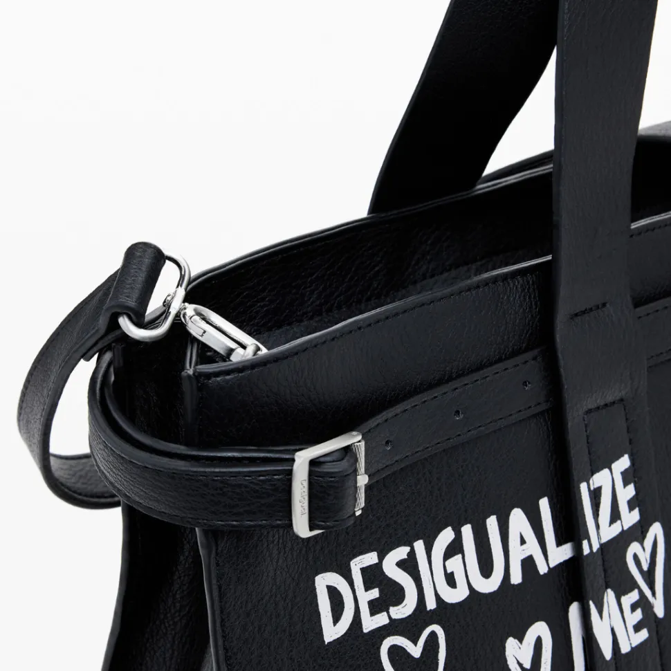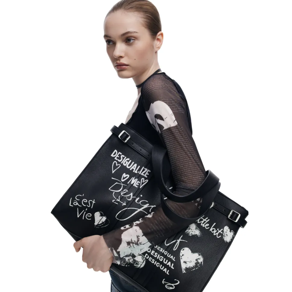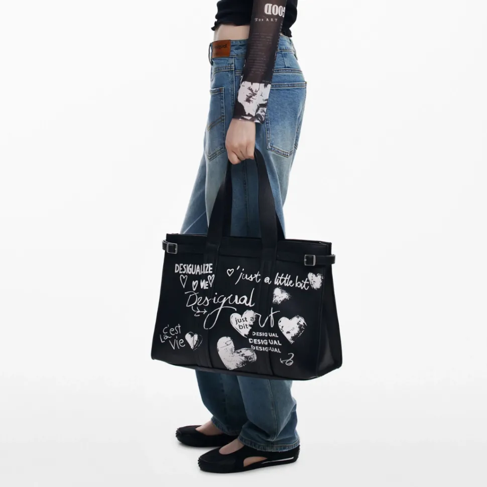 Large shopper bag in plain leather-effect fabric with handwritten scribble-style print.