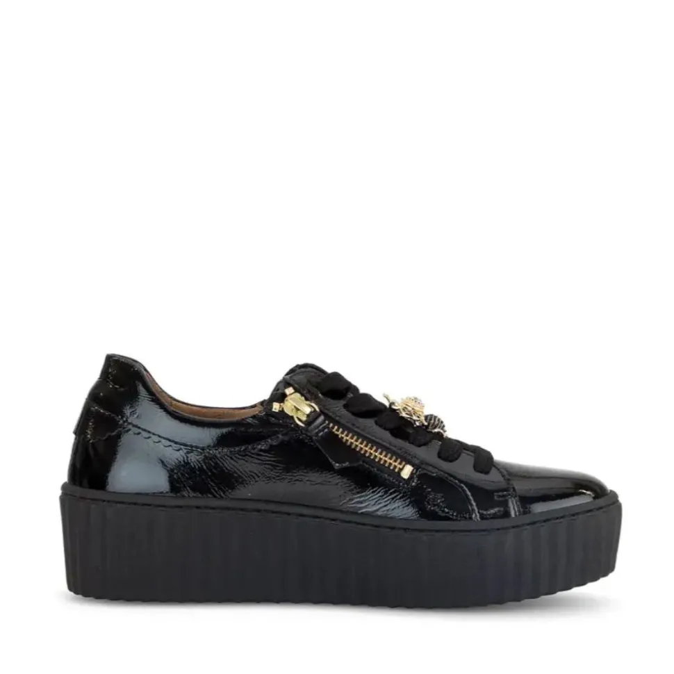Add a bold touch to your look with this platform sneaker by Gabor. Crafted in genuine leather, it features refined details: a side gold zipper, laces adorned with metallic bee charms, and a structured platform sole that combines style and comfort. The interior, lined with genuine leather and synthetic leather, includes a removable insole for a personalized fit. A trendy urban shoe, perfect for enhancing your casual outfits.