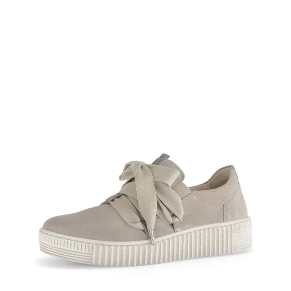 A perfect blend of style and comfort, this beige leather low shoe from Gabor is an everyday essential. Its premium leather upper, made from environmentally-friendly tanning, is combined with a leather lining for breathable comfort. Thanks to its Best Fitting last, it offers an enlarged forefoot landing surface, ideal for long-lasting well-being. The removable insole, partly made from recycled materials, rests on a 3.5 cm flat sole with a modern look. The wide elastic lace ensures a quick fit and a casual-chic look.