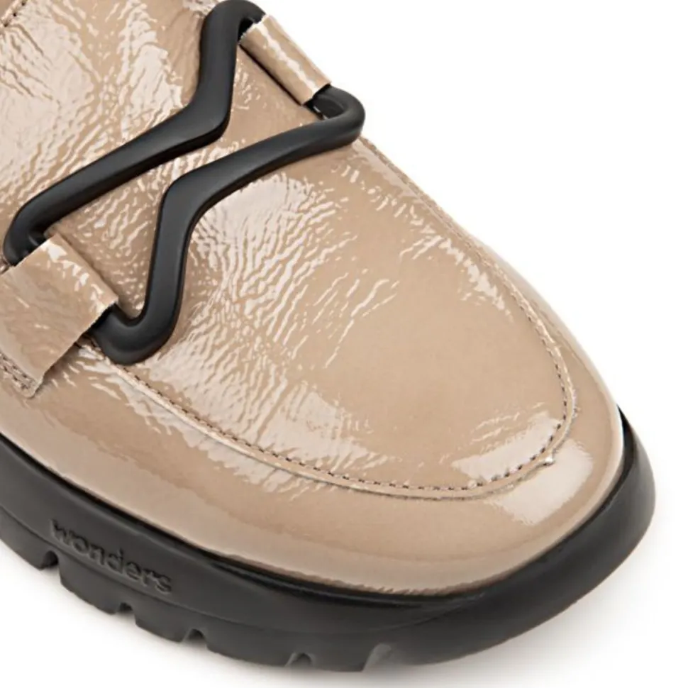 Add a modern, refined touch to your outfits with these platform loafers by Wonders. Crafted from quality patent leather in an elegant beige hue, they feature matte black trim on the vamp, providing a graphic contrast. Their 35 mm rubber outsole offers comfort and stability, while the removable leather insole with memory gel ensures optimal cushioning all day long. Lined with leather and textile, these moccasins combine contemporary style with exceptional comfort, for a polished look every day.