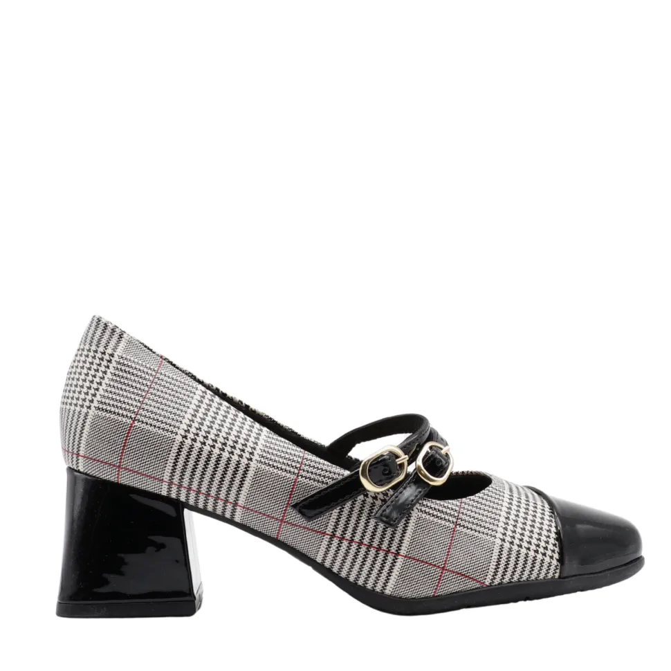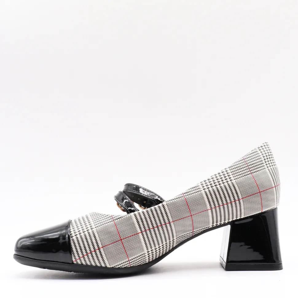 A square-heeled shoe that revisits classic elegance with a modern twist. Made from synthetic material, it features a timeless tartan pattern, enhanced by a black patent toe and decorative straps with gold buckles. The block heel ensures comfort and stability, while providing a chic look for the office and out on the town.