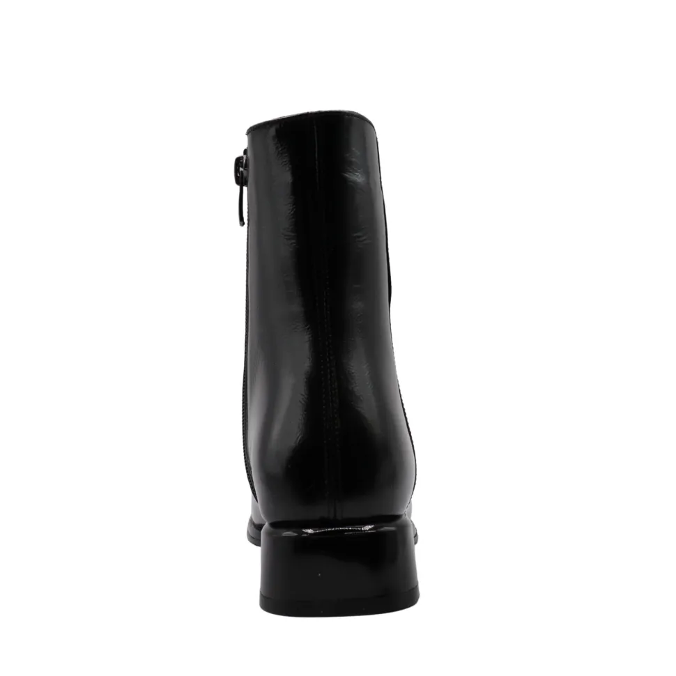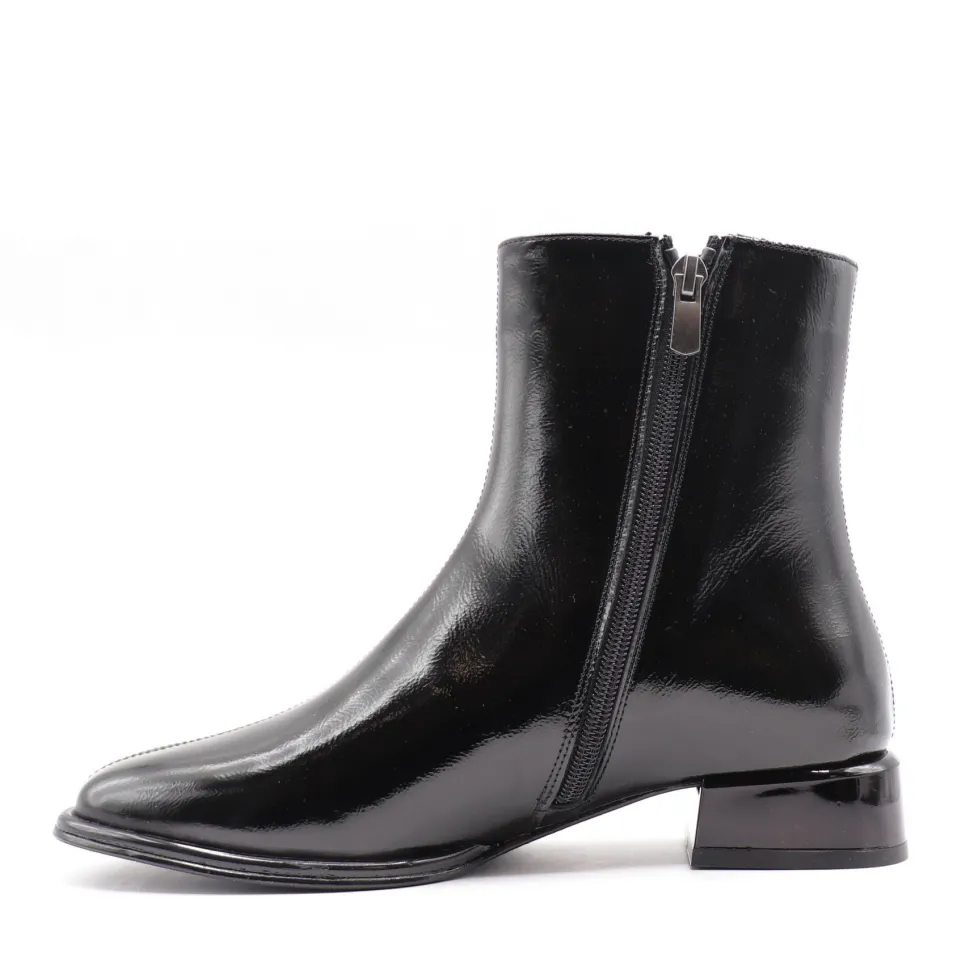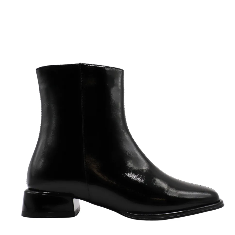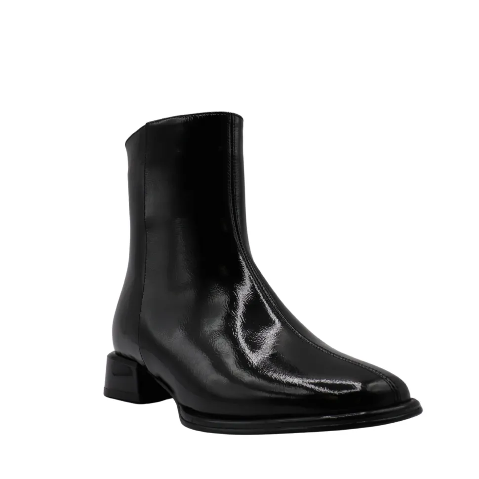 Lova boots by Apropo embody modern elegance with their shiny patent leather and minimalist silhouette. Their slightly pointed toe and low square heel add a chic, contemporary touch, ideal for enhancing your everyday looks or dressy outfits. A discreet zipper facilitates slip-on while maintaining a refined look.