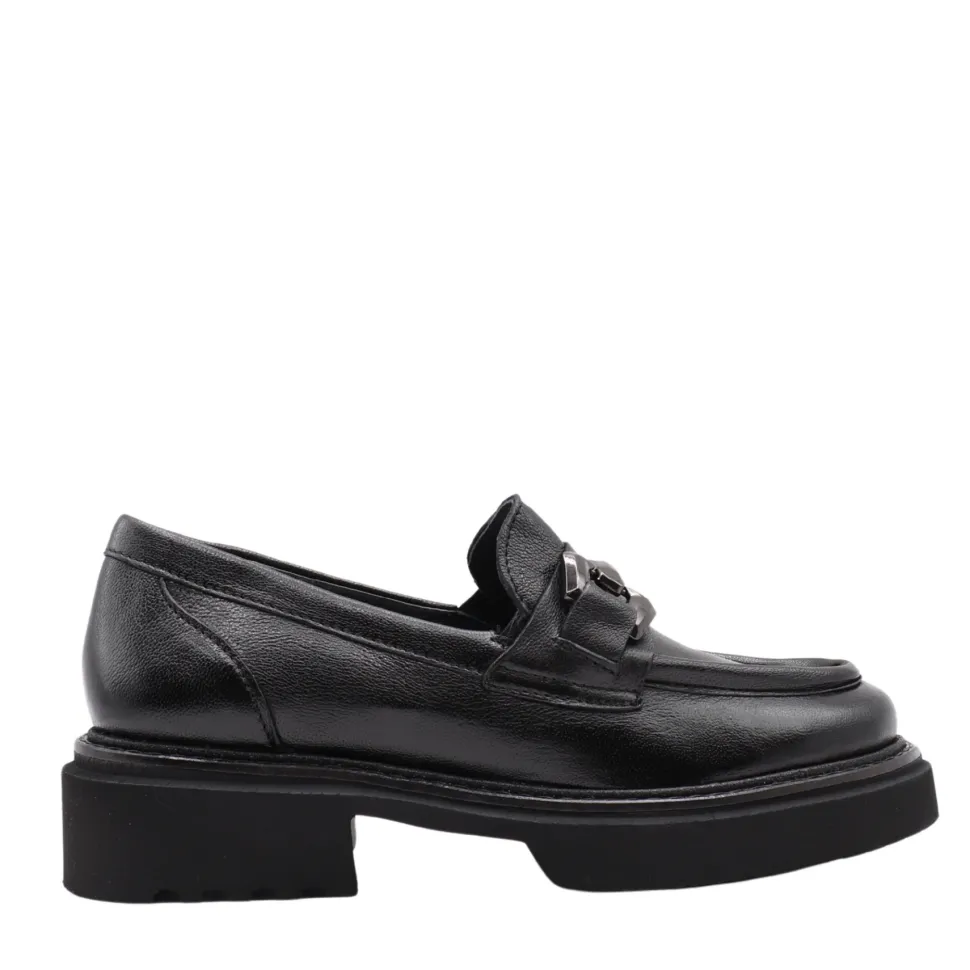 The RUTHY moccasin revisits a classic with a bold, contemporary twist. Made in Portugal from genuine leather, its sleek design is enhanced by an oversized decorative chain on the vamp, adding character and modernity.