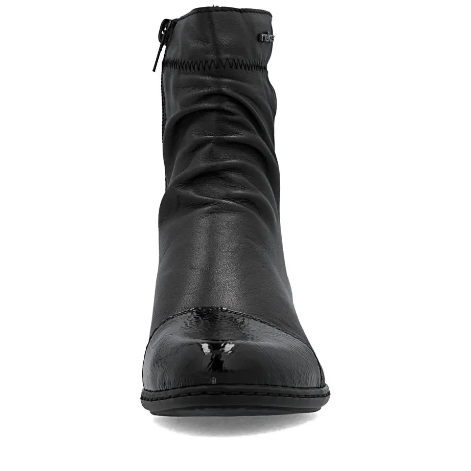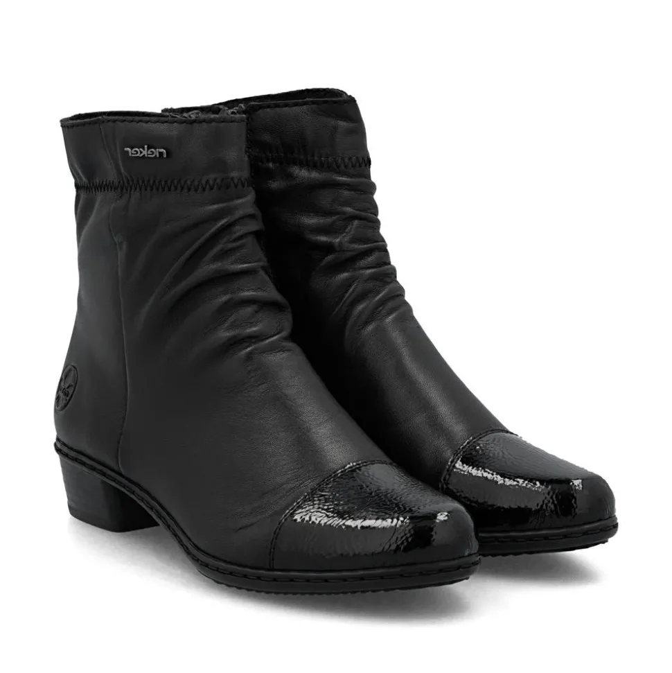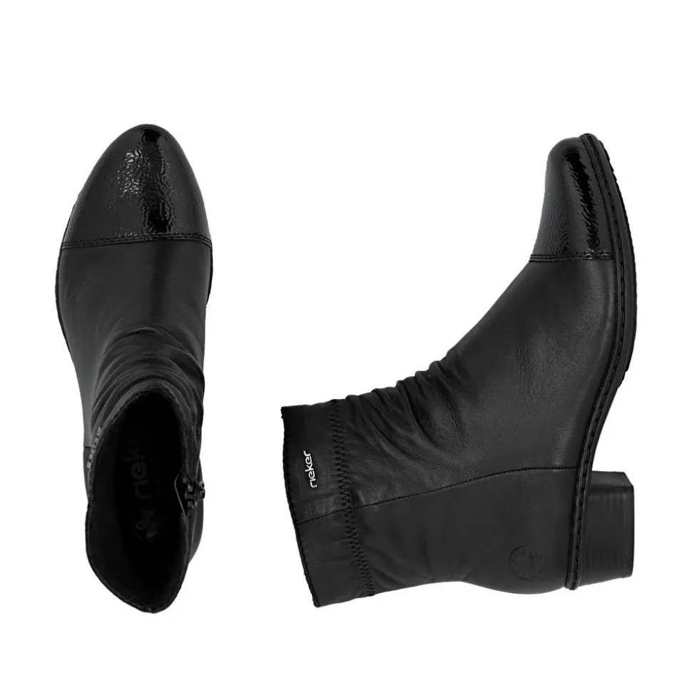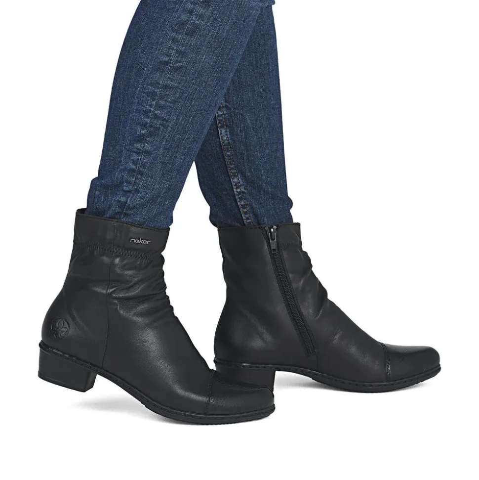 When fashion meets functionality. These black Rieker ankle boots in smooth leather are a comfortable companion. Made with stitched construction, they are sturdy, flexible and offer a perfect fit. The zipper allows for quick slip-on. The block-heel sole is both lightweight and cushioning, offering double the comfort with every step. There’s nothing to stop you taking long walks!