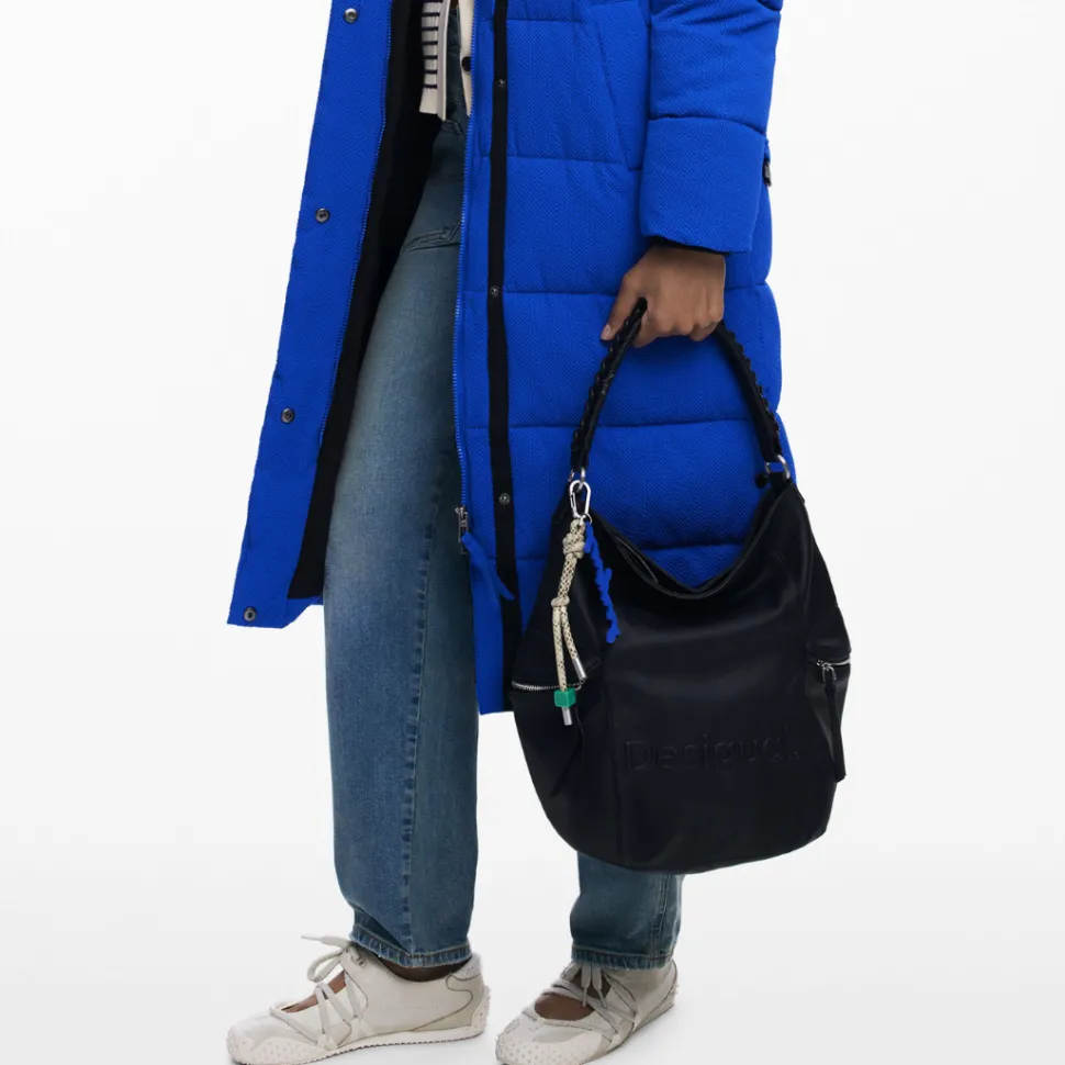 Large faux-leather backpack with 3D embossed logo, zipper closure and removable straps for conversion into a bag.