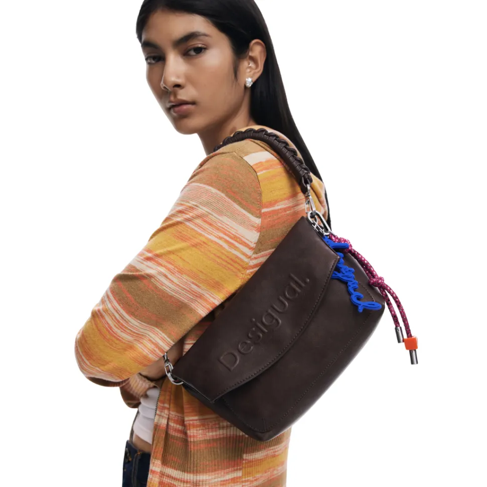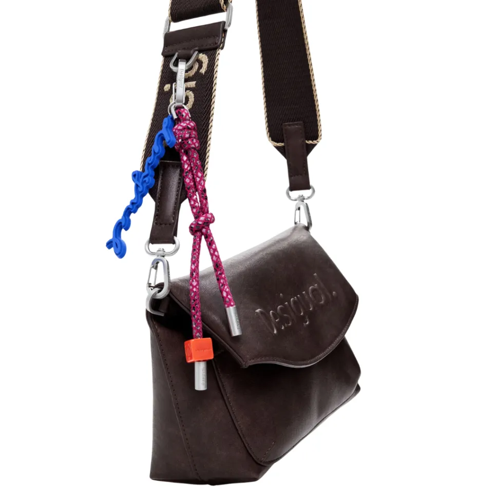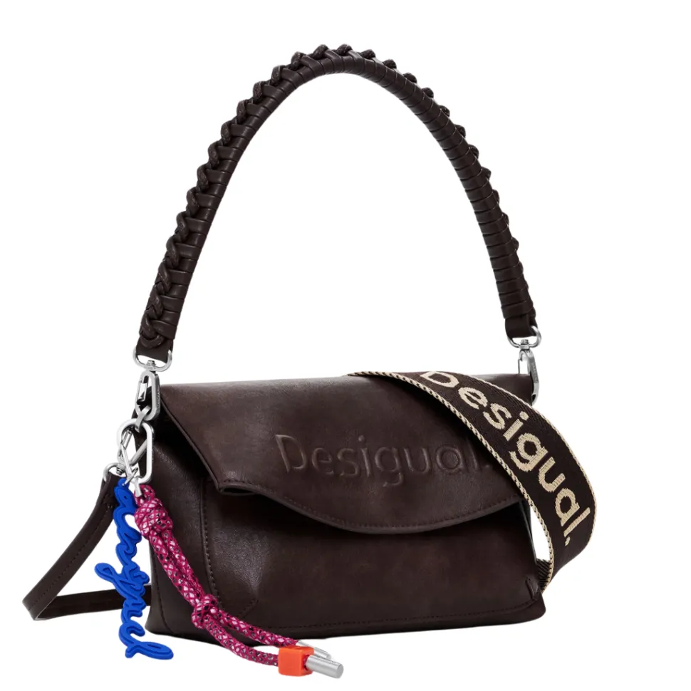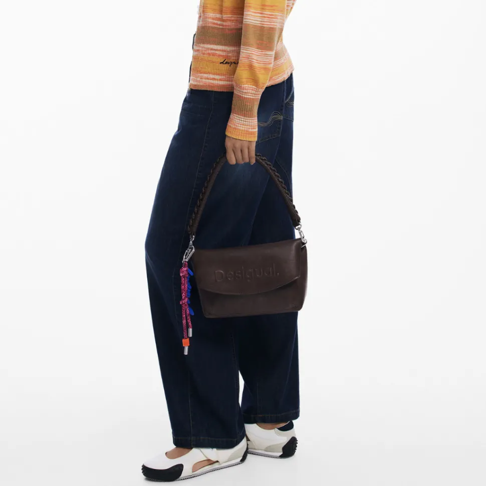 Imitation leather shoulder bag with 3D embossed logo, expandable flap, key ring detail and interchangeable handles.