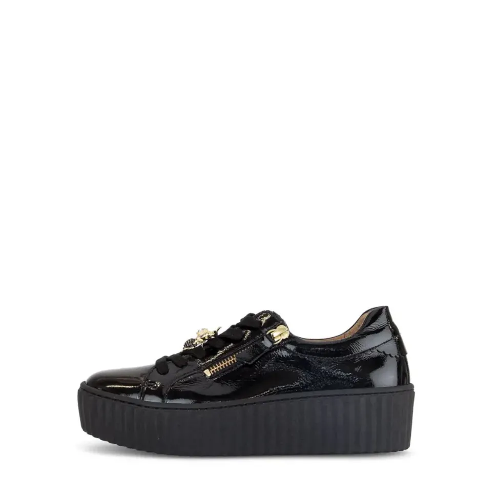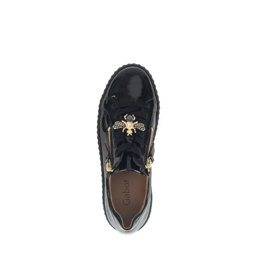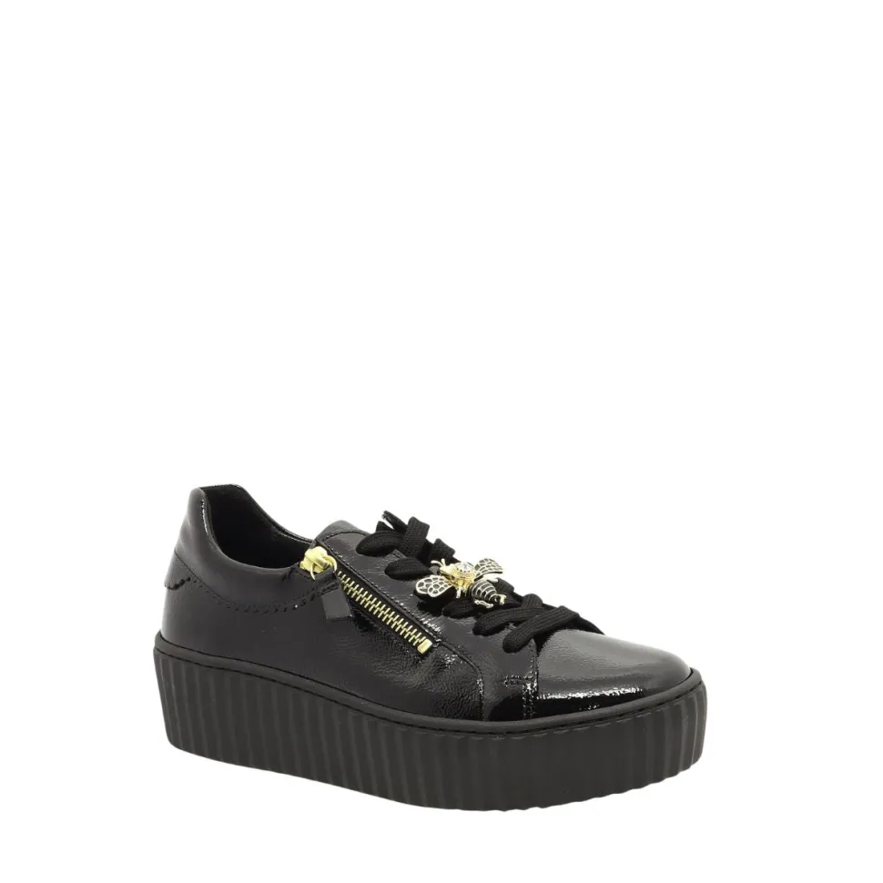 Add a bold touch to your look with this platform sneaker by Gabor. Crafted in genuine leather, it features refined details: a side gold zipper, laces adorned with metallic bee charms, and a structured platform sole that combines style and comfort. The interior, lined with genuine leather and synthetic leather, includes a removable insole for a personalized fit. A trendy urban shoe, perfect for enhancing your casual outfits.