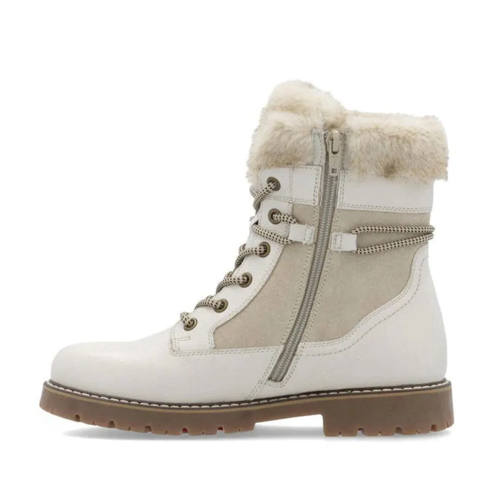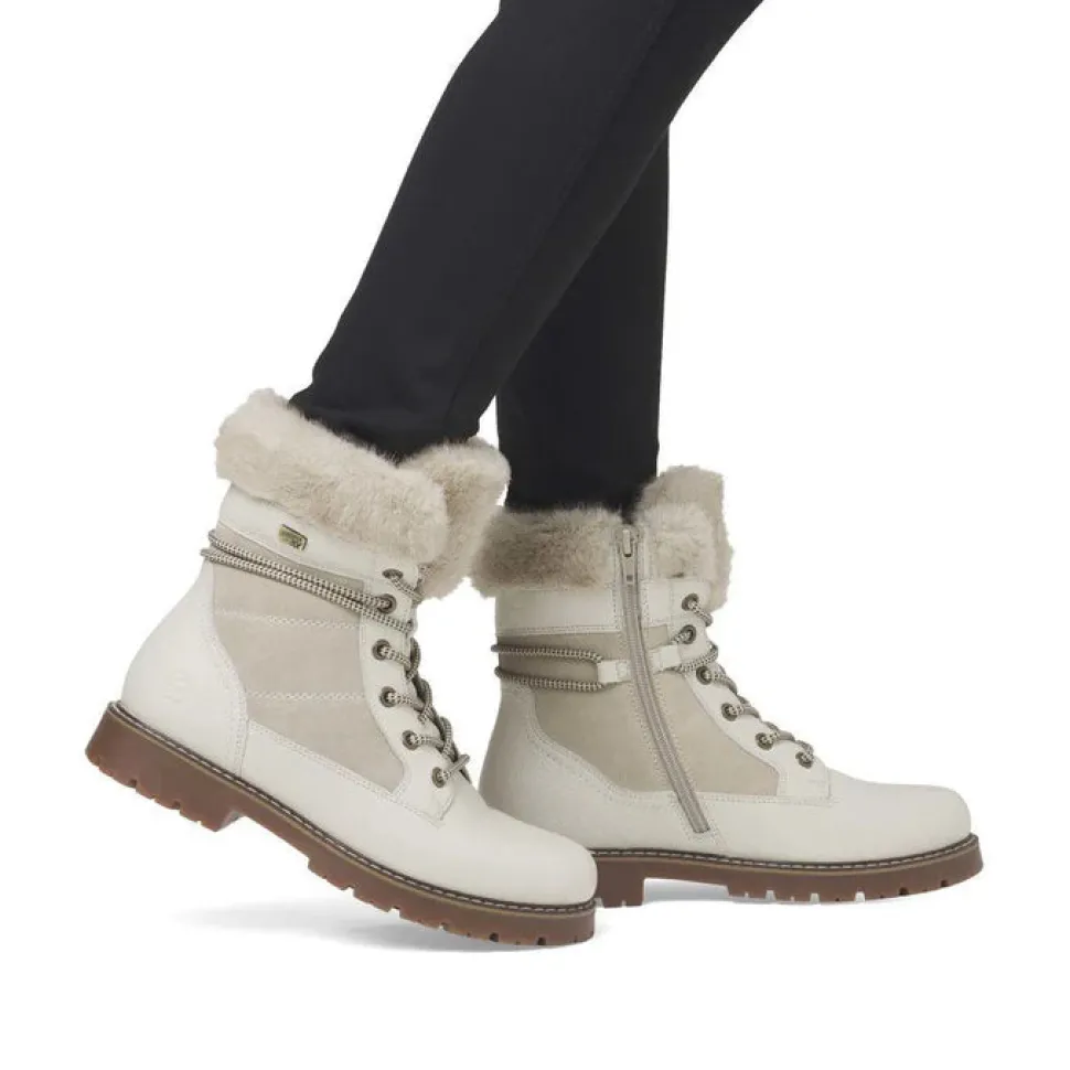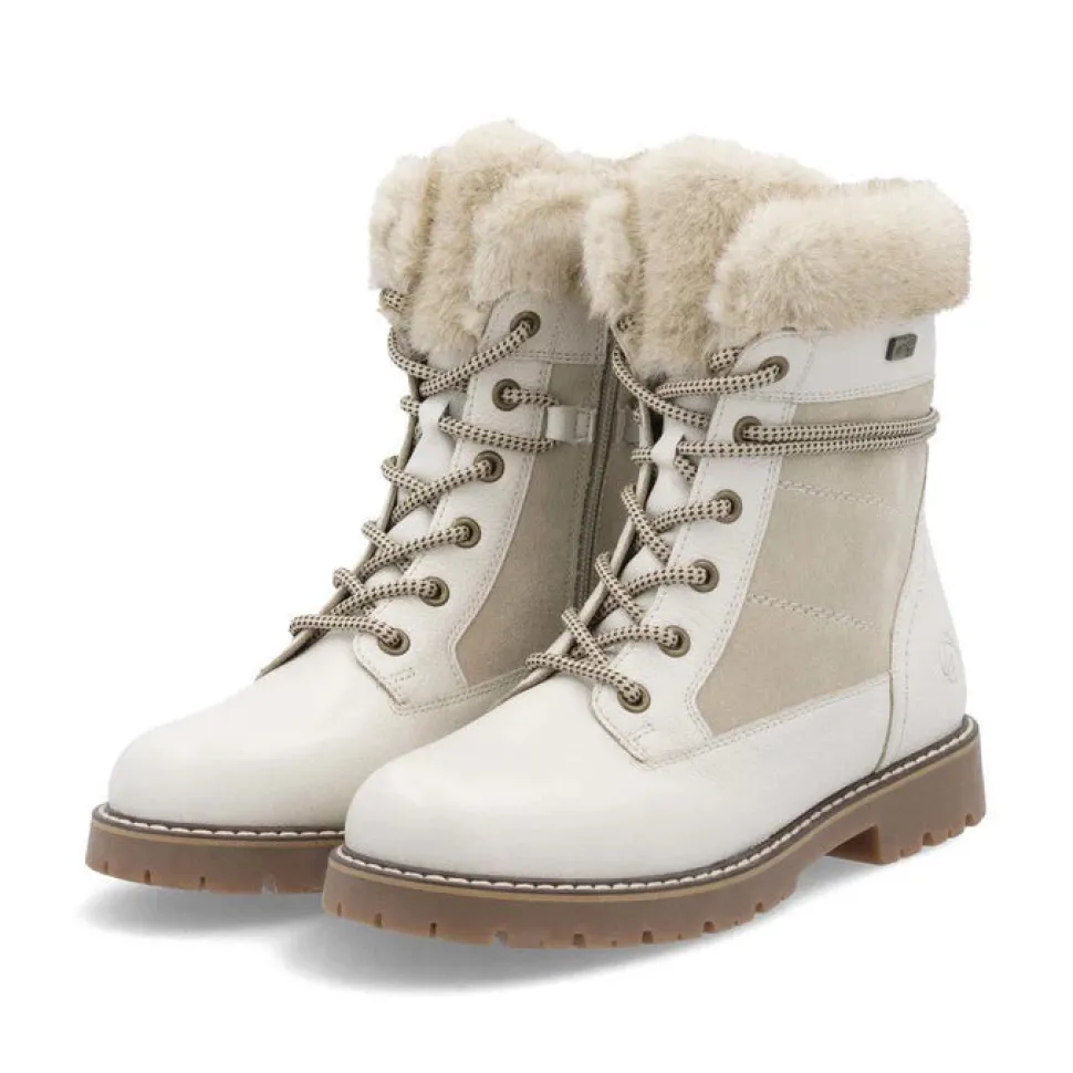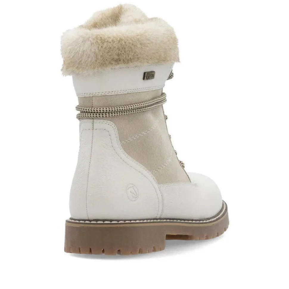 Style and comfort: this season’s dream duo! With these Remonte midnight black lace-up ankle boots in smooth leather, you’ll be cool and casual, yet elegant. The clever combination of lacing and zipper makes them easy to put on and take off. The fur collar on the upper is an eye-catcher. The cushioned, grippy block heel sole ensures good grip in all conditions. The G comfort width gives the toes greater freedom of movement. Thanks to the remonteTEX membrane, the inside of the shoe stays dry, while Flip-Grip studs provide optimum grip on slippery surfaces and the thermal insole ensures warmth. Thanks to the cozy, extra-warm virgin wool, the cold doesn’t stand a chance.