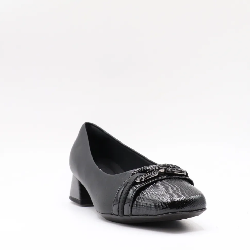 Subtle elegance and modern comfort. This black Piccadilly pump features a patent and metallic toe detail that adds a chic touch to its understated design. Its textured block heel ensures a modern look while offering stability and comfort for everyday wear. Perfect for the office or special occasions, they combine refinement and practicality.