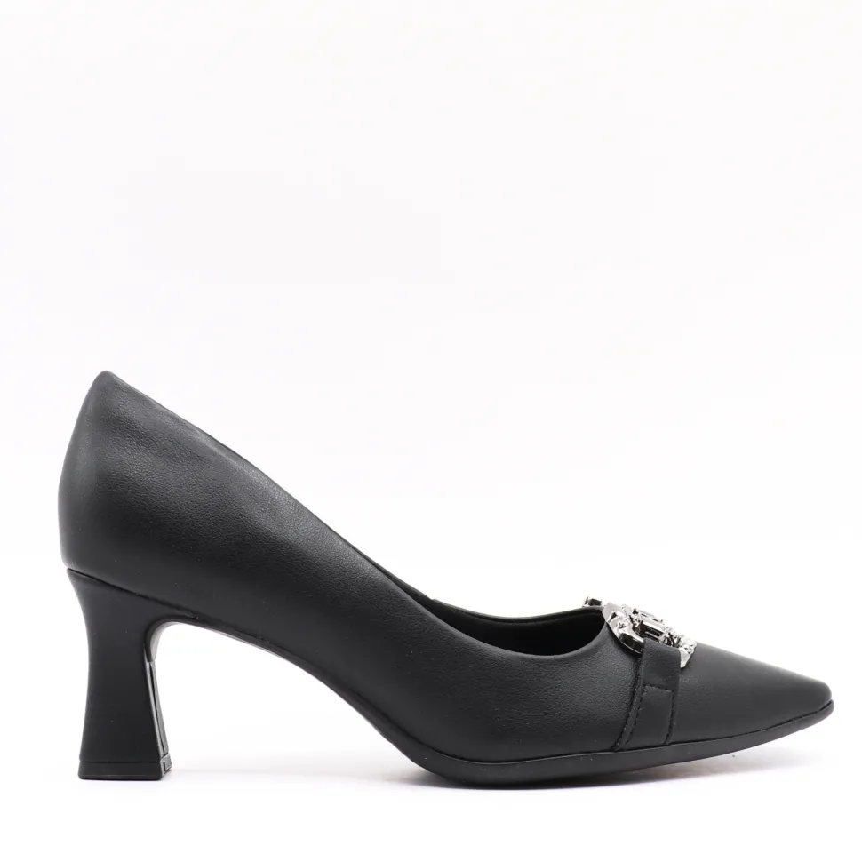 A refined pump that combines elegance and comfort. Made of synthetic material, it features a pointed toe and sophisticated metal embellishment at the front for a chic touch. Its slim, stable heel offers a sleek silhouette, perfect for special occasions as well as elegant professional wear.