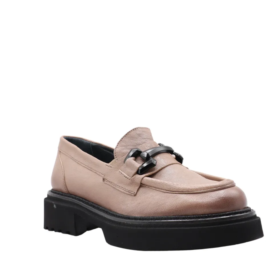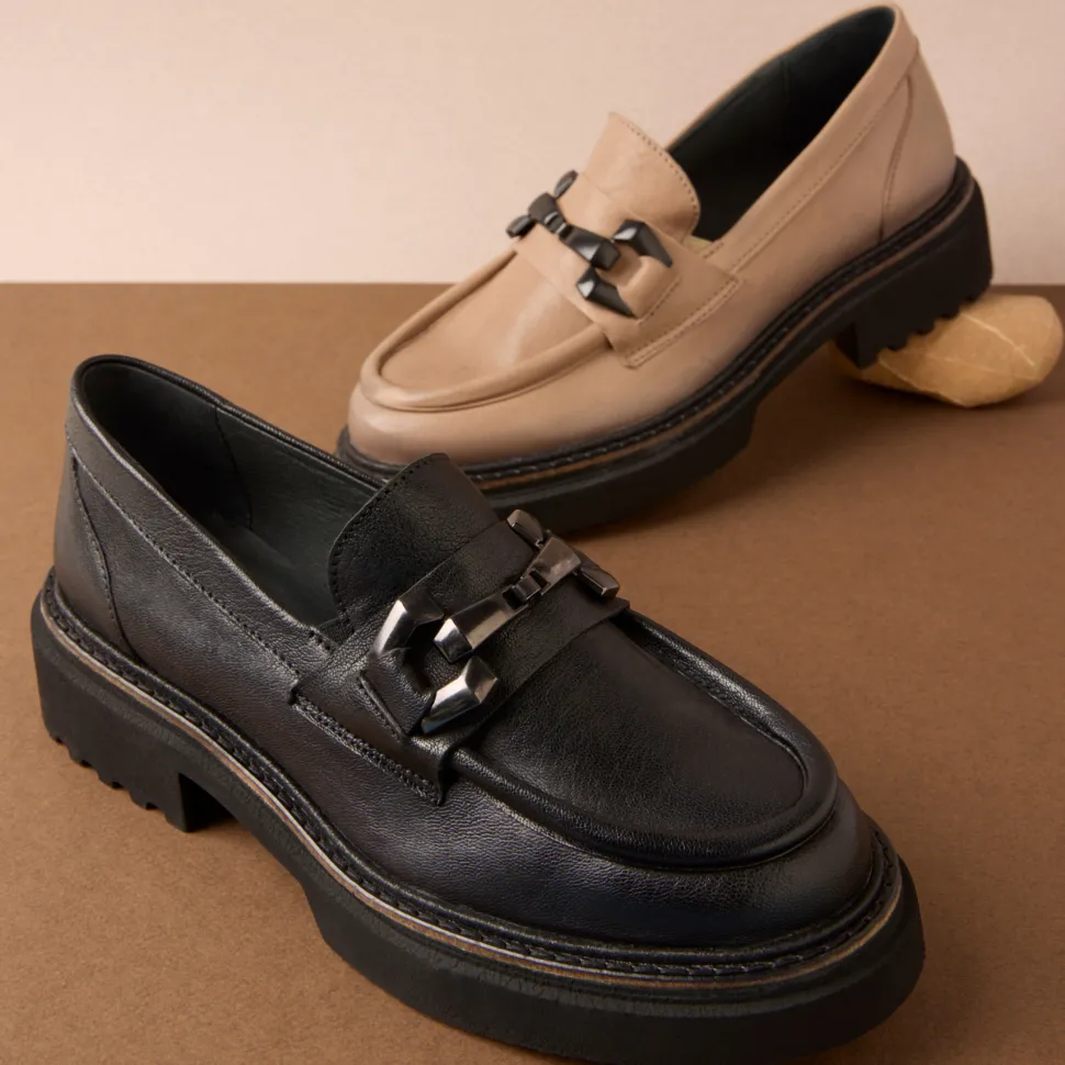 The RUTHY moccasin revisits a classic with a bold, contemporary twist. Made in Portugal from genuine leather, its sleek design is enhanced by an oversized decorative chain on the vamp, adding character and modernity.