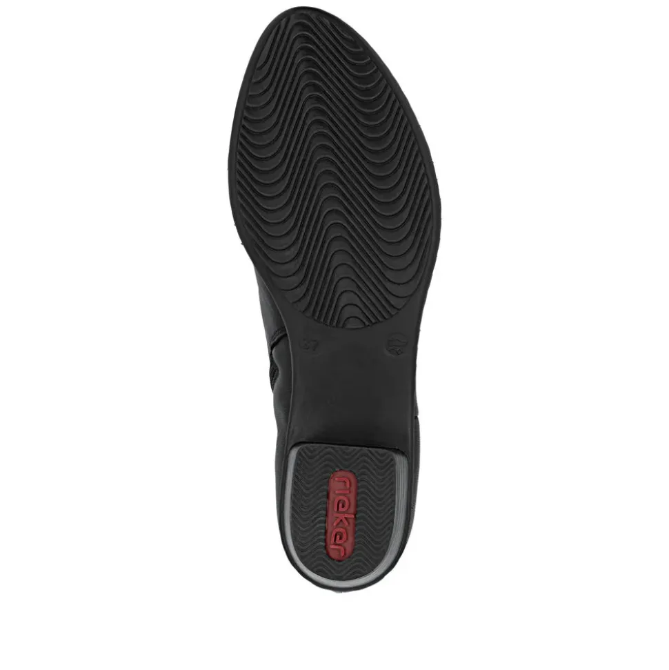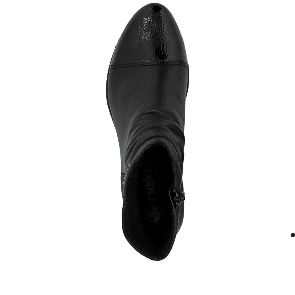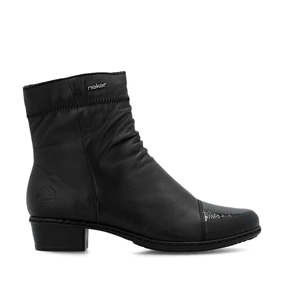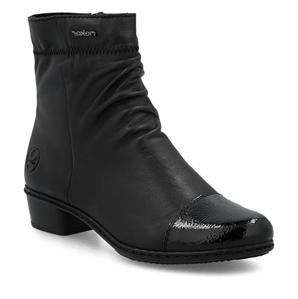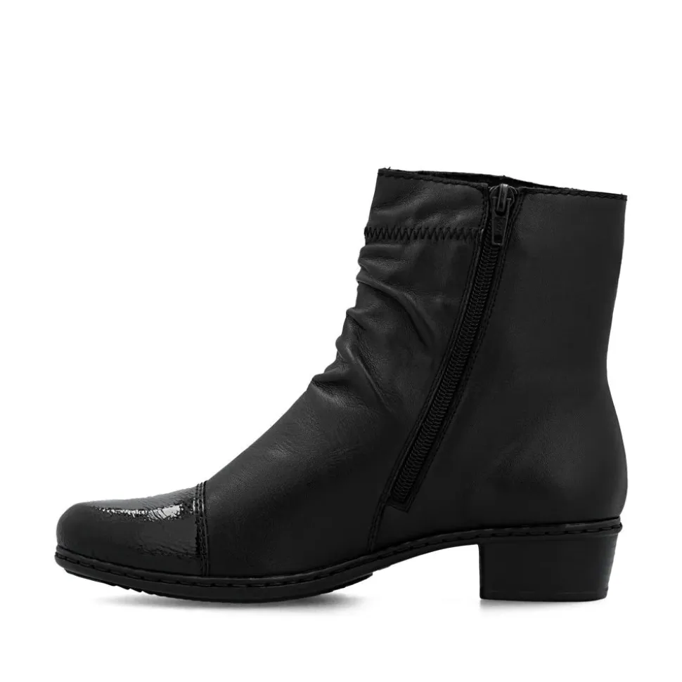 When fashion meets functionality. These black Rieker ankle boots in smooth leather are a comfortable companion. Made with stitched construction, they are sturdy, flexible and offer a perfect fit. The zipper allows for quick slip-on. The block-heel sole is both lightweight and cushioning, offering double the comfort with every step. There’s nothing to stop you taking long walks!